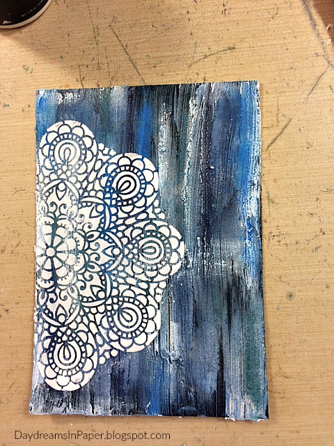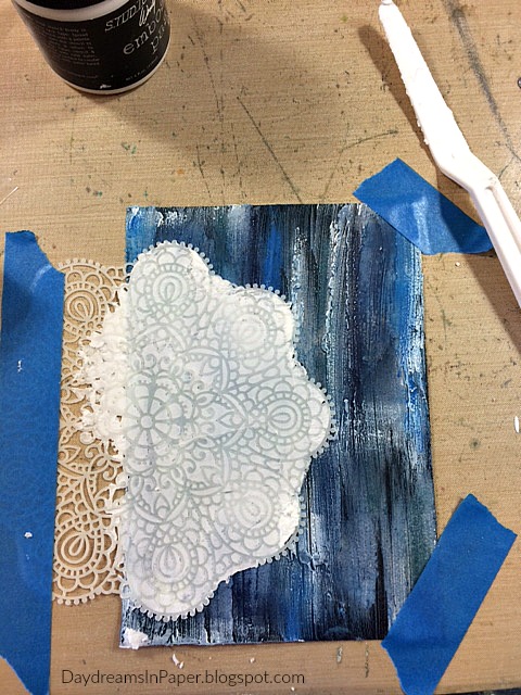 I place the Simon Says Stamp Circular Lace stencil over half of the background and tape it down so it doesn’t move while I apply the embossing paste.