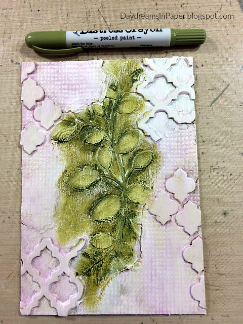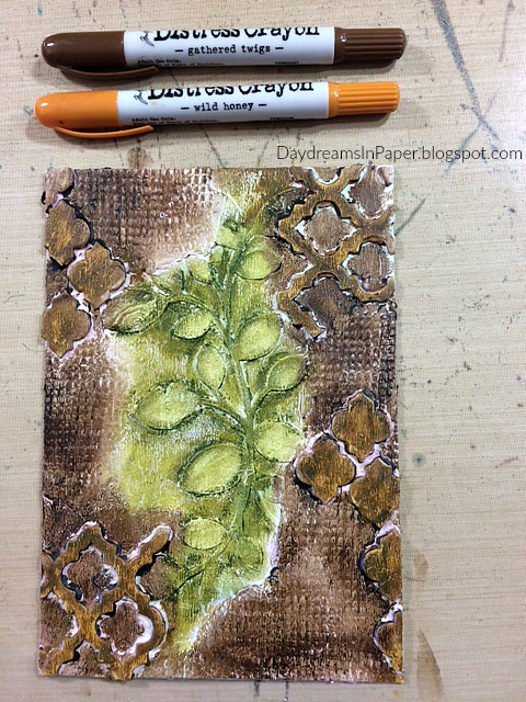 I cover the trellis pieces and rest of the background with Gathered Twigs and Wild Honey Distress Crayons. I color on the pigment in random areas and move it around with my fingertips until I’m pleased with the way it looks.