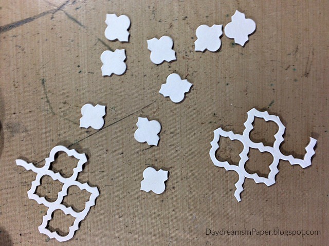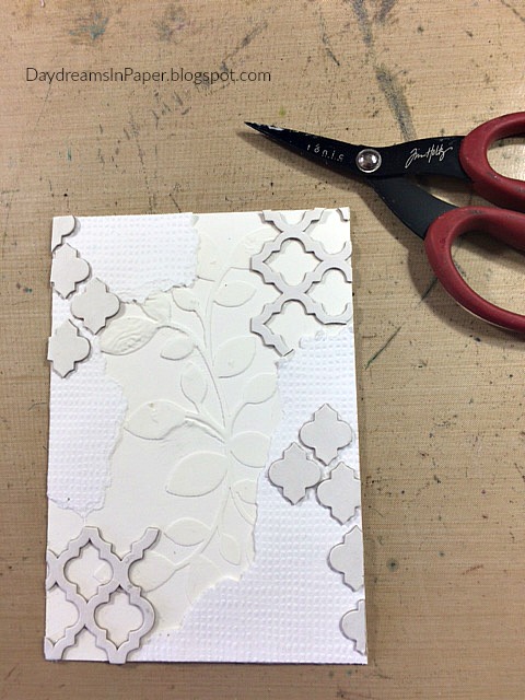 I use the Tim Holtz Trellis Frameworks die to create small pieces that I want to add to the panel. These pieces are cut out from white chipboard. I use the trellis along with the leftover cutout pieces.