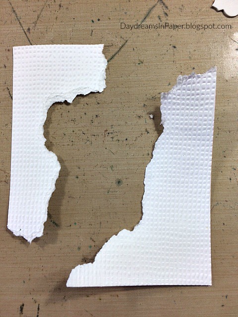 I embossed a 5″ x 7″ piece of Neenah Solar White 110 lb. cardstock with the Tammy Tutterow Horsehair Embossing Folder and tear it along two of the corners.