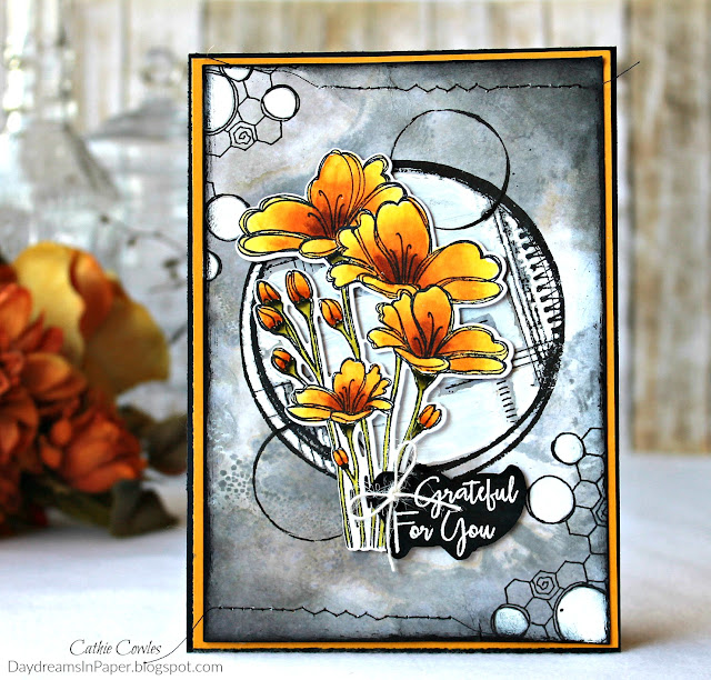 Stamp the Wendy Vecchi Circle Collage stamp in the center of the background with Simon Says Stamp Intense Black Ink.