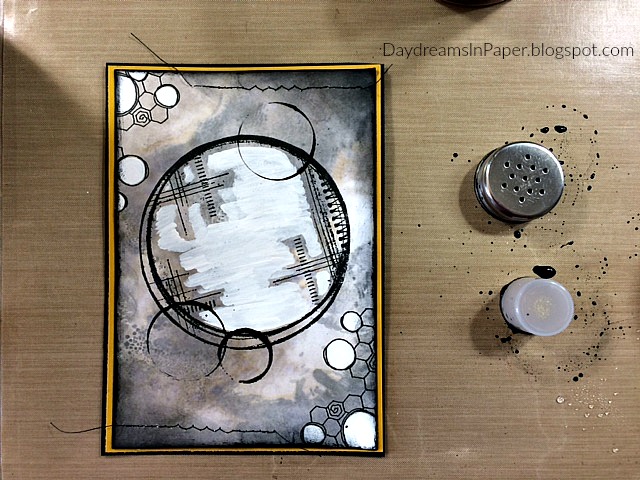 Stamp the Wendy Vecchi Circle Collage stamp in the center of the background with Simon Says Stamp Intense Black Ink.