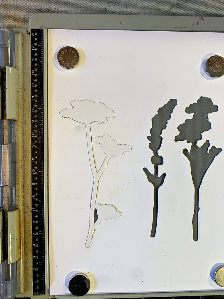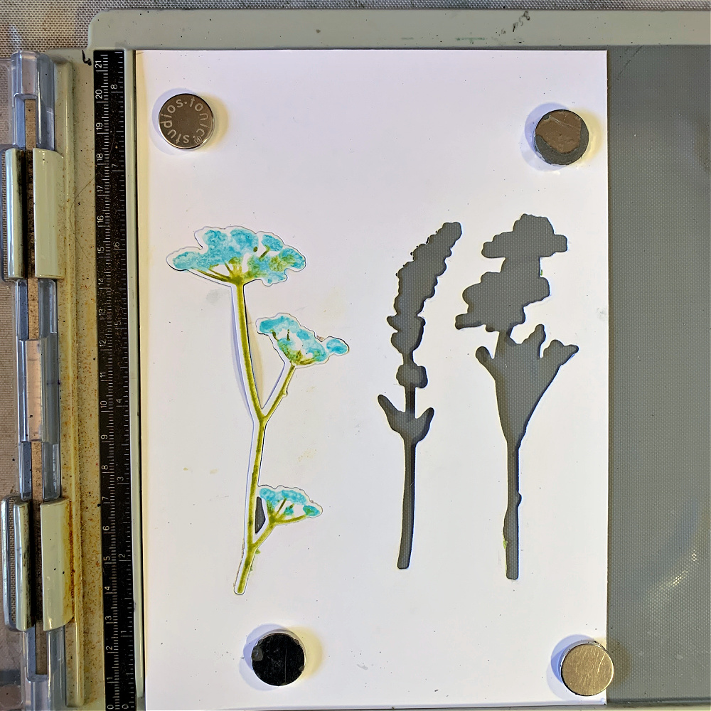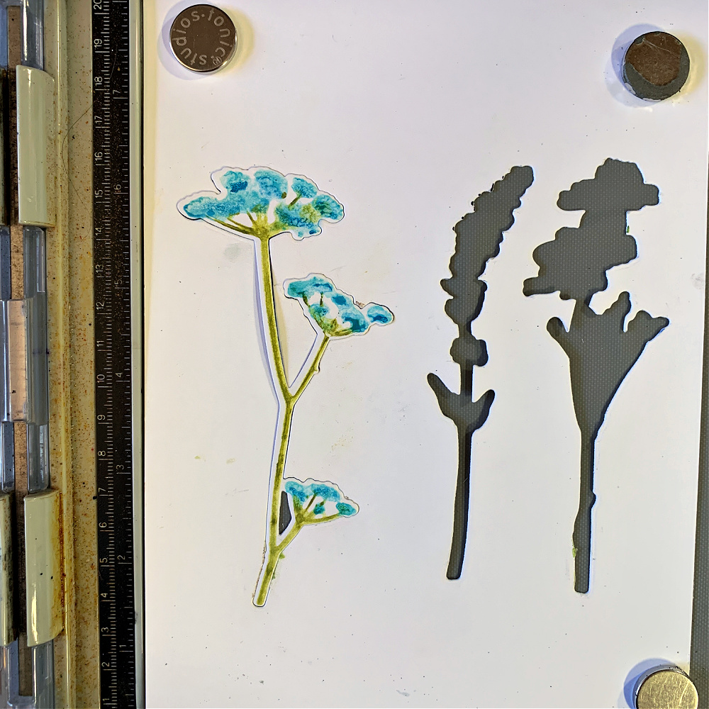 Choose the wildflowers you wish to use and cut them out on a scrap piece of watercolor cardstock that will easily line up in the corner of your stamping tool. Take the piece of watercolor cardstock that you cut the flowers from and place it in the corner of your stamping tool as shown below and set aside the flowers that were cut.