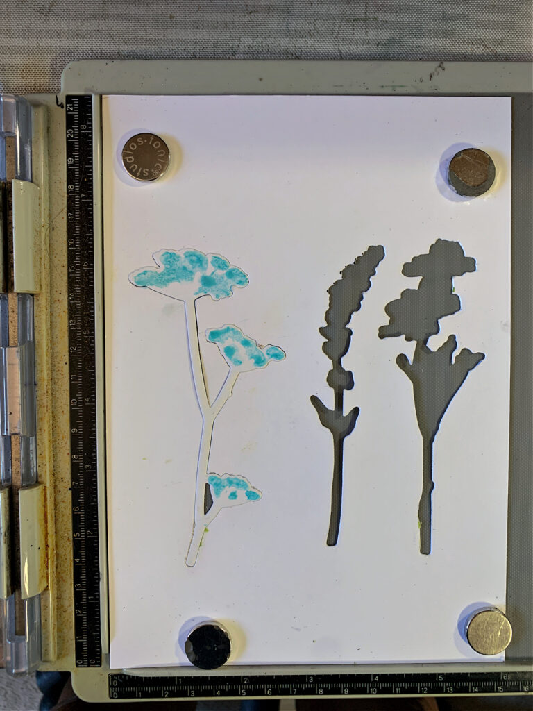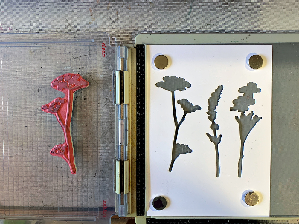 Close the door of your stamping tool to pick up the stamp readying it for stamping. It is very important that you do NOT remove the stamp from the stamping tool or remove the cut out wildflower cardstock piece from the other side of the tool. Leave them both in place.