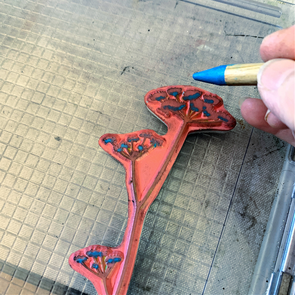I colored my wildflowers with Distress Crayons. Saturate the tip of the crayon by dipping it in water making sure it’s nice and wet. Color over the area of the image you wish to apply this color.