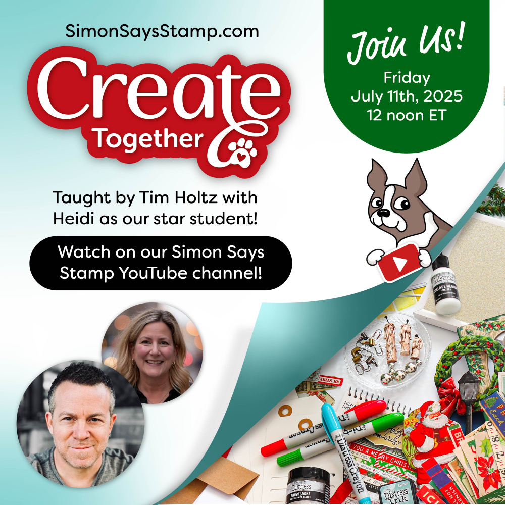 Also, join Heidi and Tim tomorrow, Friday, July 11th at 12 noon EDT on the Simon Says Stamp YouTube Channel for a fun time of creating together for the virtual LIVE class, Holiday Collage. This class will be taught by Tim Holtz. Please join in for all the fun. Details are in the graphic below.
