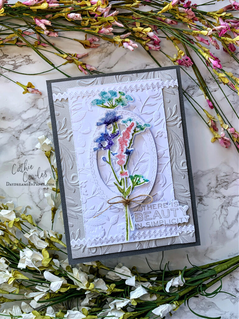 I hope you enjoyed seeing how I colored and cut the wildflowers for my card. The coordinating Tim Holtz stamp dies are so fun to work with and I’m head over heals in love with the Ornate Trims coordinating die set. I’ve put an ornate trim on every card I’ve created since receiving them. They are perfection!