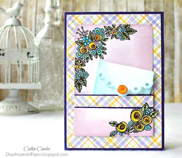 To complete the card, I color and fussy cut some flowers from the Choose Joy stamp and adhere them to the bottom corner of the pocket. I adhere the pocket to a 4-1/4″ x 6″ piece of My Favorite Things Plaid Patterns card stock and adhere that panel onto a 4-1/2″ x 6-1/4″ piece of Bazzill Jelly Bean card stock. My secret note is tucked inside the envelope that is sealed with a small piece of Velcro and decorated with a small orange button. I hope you got some ideas for a fun pocket card where the message is only between you and the recipient. Have fun!!