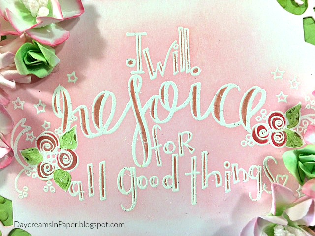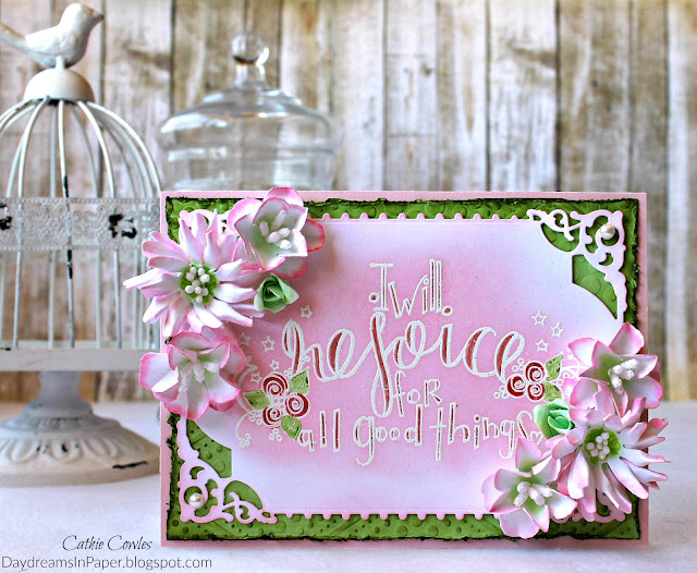 Hi everyone, thanks for stopping by! Today I created a card using the Tammy Tutterow Designs Rejoice stamp set and some flowers created from the Shabby Posies and Pinwheel Posies die sets. Below are step by step instructions on how to create the flowers and how I created a soft image using white embossing powder and light colorization with Spun Sugar Distress Ink. I hope you enjoy the tutorial and that you can take away some inspiration for your next project.