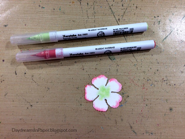 Next, color the petals and center of petals with Red Geranium and Pale Green Zig Clean Color Real Brush Markers. To get soft colors, make sure you are using enough water to dilute the colors. These are very vibrant markers.