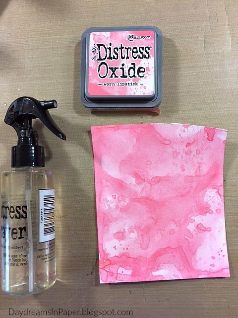 To create the heart, color a piece of Strathmore Bristol watercolor paper with a mixture of water and Worn Lipstick Distress Oxide. To do this, smudge the ink oxide pad on a craft mat several times in over a large area and then spray with water. Spray the watercolor paper with water as well and run the watercolor paper through the oxide mixture. Do this several times but make sure to dry each layer completely before adding another layer.